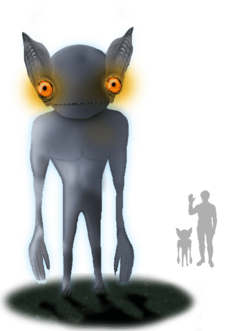 Description: 4 feet tall; pale skin; bald; large round eyes; pointed ears; no nose; clawed hands; slit for mouth; makes chirping sounds.