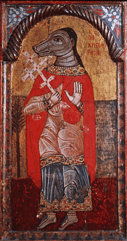 The picture I have there is of St. Christopher, and this is really what got me searching. Why would anyone paint a saint like that? I’ve read stories that St. Christopher was a Canaanite and someone misinterpreted it as canine-nite (hilarious…), but why is he painted like that? I couldn’t find an answer to that question.
